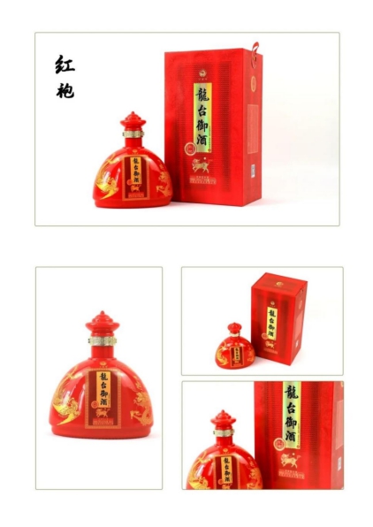 紅袍產品以清朝官服為主要設計理念,以大氣喜慶的中國紅顏色為酒瓶和酒盒主體外觀色。瓶體、盒體以協調圓潤為基調,配以龍鳳和麒麟圖案,寓意龍鳳呈祥,麒麟送子和步步高升,美滿和諧之意。